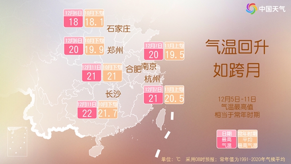 中国天气网讯 眼下,全国大部持续升温,本周末(12月6日至7日)气温将从北到南陆续升至近期高点,石家庄、郑州、南京、杭州等地将体验当地10月下旬或11月上旬才有的暖意。不过,下周有两股冷空气先后来袭,各地又将迎来明显降温炒股配资查询之家,建议公众关注气温变化,及时添衣保暖。